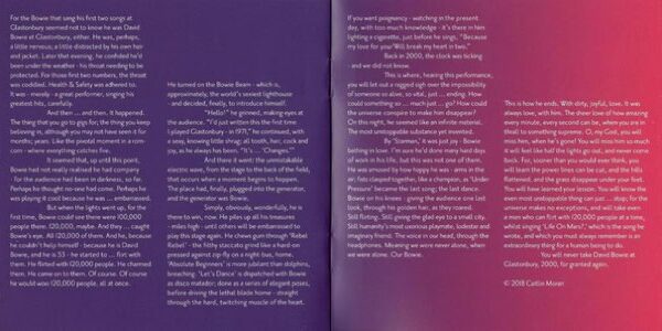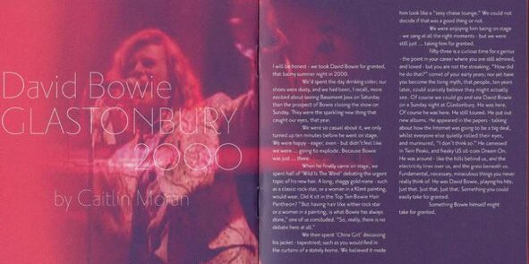The film documents Bowie’s legendary Sunday night headlining performance on June 25th, 2000, at one of the most famous festivals on earth. The package will include the full 21-song greatest-hits set and, for the first time, a DVD of the entire David Bowie show (only 37 minutes of which has ever been broadcast on TV).