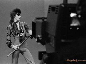 Dressed in a striking costume, his hair dyed reddish-brown, Bowie launched his Ziggy Stardust stage show with the Spiders from Mars—Ronson, Bolder and Woodmansey—at the Toby Jug pub in Tolworthon 10 February 1972. The show was hugely popular, catapulting him to stardom as he toured the UK over the next six months and creating, as described by Buckley, a “cult of Bowie” that was “unique—its influence lasted longer and has been more creative than perhaps almost any other force within pop fandom.” The Rise and Fall of Ziggy Stardust and the Spiders from Mars (1972), combining the hard rock elements of The Man Who Sold the World with the lighter experimental rock and pop of Hunky Dory, was released in June. “Starman“, issued as an April single ahead of the album, was to cement Bowie’s UK breakthrough: both single and album charted rapidly following his July Top of the Pops performance of the song. The album, which remained in the chart for two years, was soon joined there by the 6-month-old Hunky Dory. At the same time the non-album single “John, I’m Only Dancing“, and “All the Young Dudes“, a song he wrote and produced for Mott the Hoople, were successful in the UK. The Ziggy Stardust Tour continued to the United States. Bowie contributed backing vocals to Lou Reed’s 1972 solo breakthrough Transformer, co-producing the album with Mick Ronson. His own Aladdin Sane (1973) topped the UK chart, his first number one album. Described by Bowie as “Ziggy goes to America”, it contained songs he wrote while travelling to and across the US during the earlier part of the Ziggy tour, which now continued to Japan to promote the new album. Aladdin Sane spawned the UK top five singles “The Jean Genie” and “Drive-In Saturday“.Bowie’s love of acting led his total immersion in the characters he created for his music. “Offstage I’m a robot. Onstage I achieve emotion. It’s probably why I prefer dressing up as Ziggy to being David.” With satisfaction came severe personal difficulties: acting the same role over an extended period, it became impossible for him to separate Ziggy Stardust—and, later, the Thin White Duke—from his own character offstage. Ziggy, Bowie said, “wouldn’t leave me alone for years. That was when it all started to go sour … My whole personality was affected. It became very dangerous. I really did have doubts about my sanity.” His later Ziggy shows, which included songs from both Ziggy Stardust and Aladdin Sane, were ultra-theatrical affairs filled with shocking stage moments, such as Bowie stripping down to a sumowrestling loincloth or simulating oral sex with Ronson’s guitar.Bowie toured and gave press conferences as Ziggy before a dramatic and abrupt on-stage “retirement” at London’s Hammersmith Odeon on 3 July 1973. Footage from the final show was released the same year for the film Ziggy Stardust and the Spiders from Mars. After breaking up the Spiders from Mars, Bowie attempted to move on from his Ziggy persona. His back catalogue was now highly sought after: The Man Who Sold the World had been re-released in 1972 along with Space Oddity. “Life on Mars?“, from Hunky Dory, was released in June 1973 and made number three on the UK singles chart. Entering the same chart in September, Bowie’s novelty record from 1967, “The Laughing Gnome“, reached number six. Pin Ups, a collection of covers of his 1960s favourites, followed in October, producing a UK number three hit in “Sorrow” and itself peaking at number one, making David Bowie the best-selling act of 1973 in the UK. It brought the total number of Bowie albums concurrently on the UK chart to six.