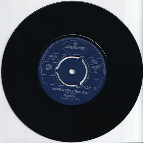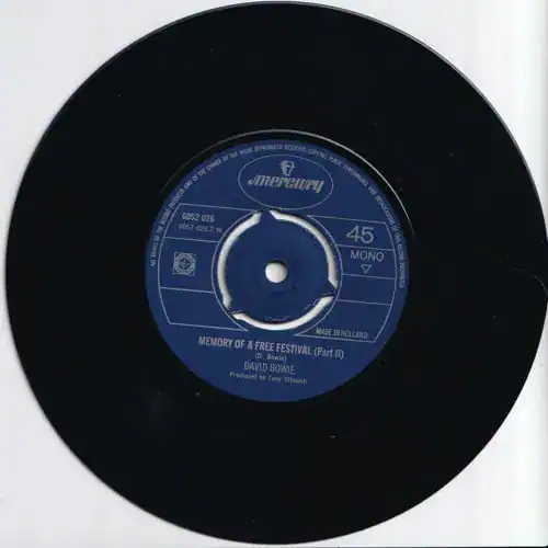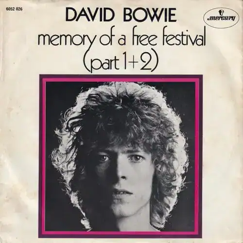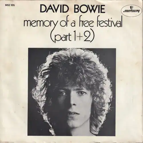 "Memory of a Free Festival" is a 1970 single. The song had originally been recorded in September 1969 as a seven-minute opus for Bowie's second self-titled album. It was reworked in March–April 1970 at the behest of Mercury Records, the label believing that the track had a better chance of success as a single than "The Prettiest Star", released earlier in the year. Bowie and Tony Visconti roughly split the track in half, re-recording it so both halves could function as individual songs. A more rock-oriented version than the earlier album cut, this rendition marked guitarist Mick Ronson's and drummer Mick Woodmansey's studio debut with Bowie's band, bringing together the line-up that would shortly record The Man Who Sold the World.